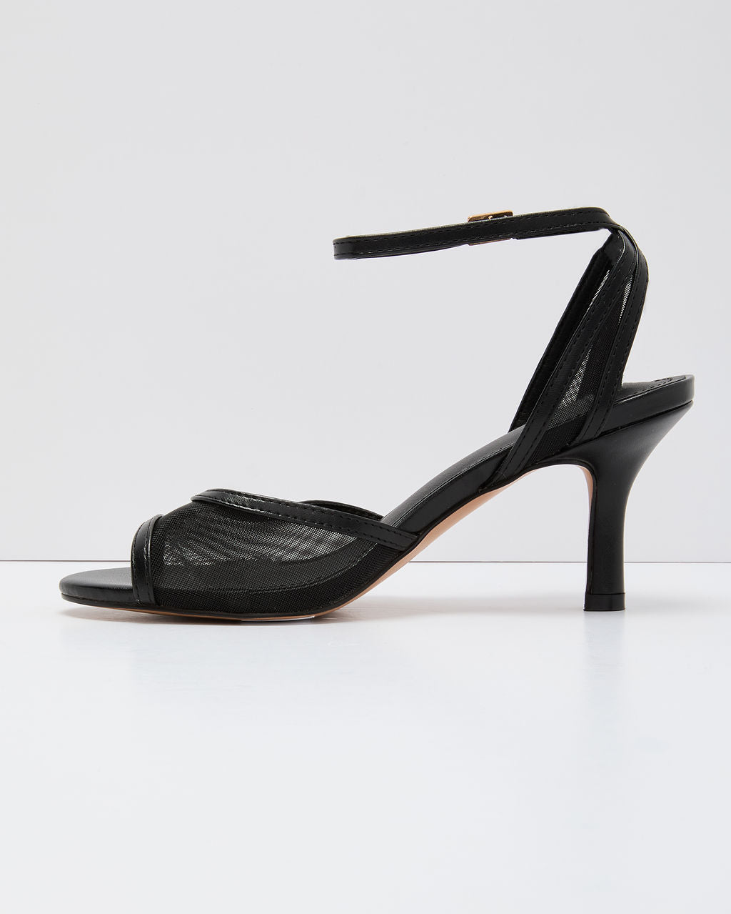 The Bare Intention Heels are for the woman who owns her allure. These heels blend modern sophistication with a hint of mystique, featuring delicate mesh panels set against sleek vegan leather. An elegant ankle strap ensures a perfect fit, while the peep-toe design offers a playful glimpse. Ideal for elevating a cocktail dress or adding a provocative finish to tailored trousers, these shoes are your new secret weapon.