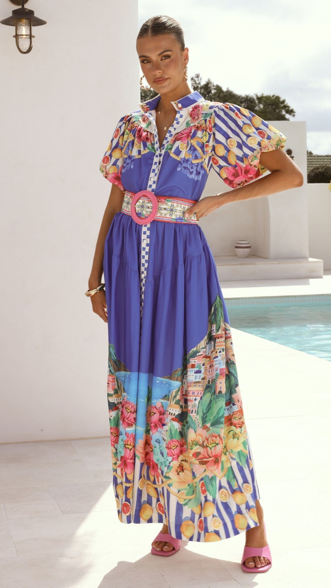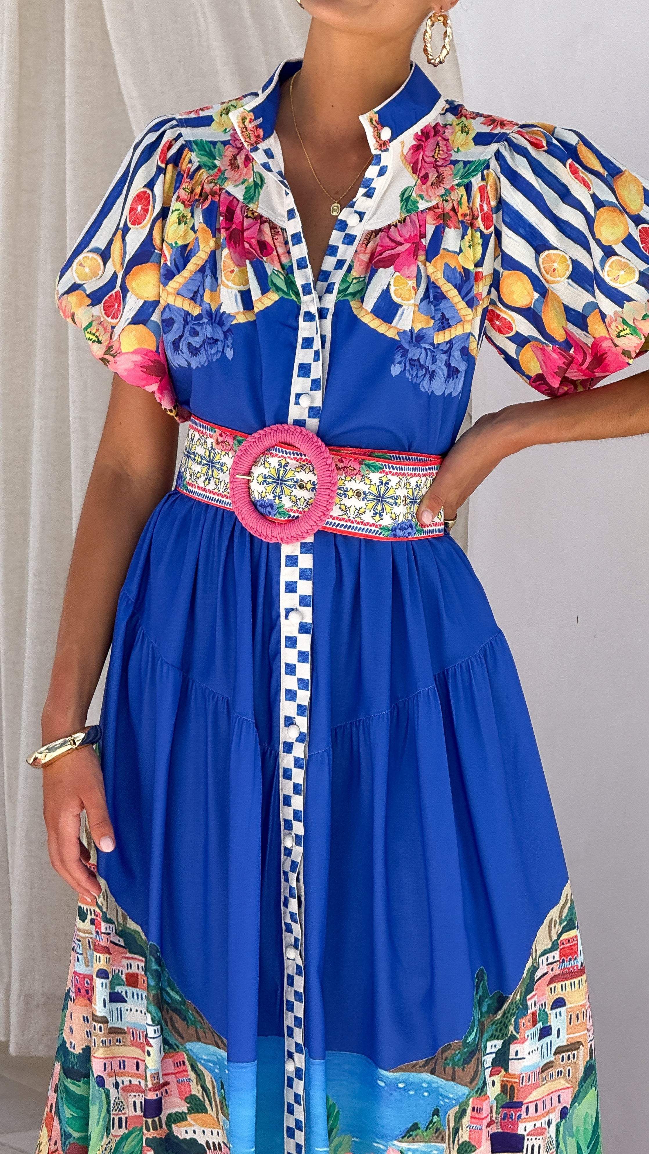 The Bloom Maxi Dress in Positano Cobalt features a playful yet elegant design with puff sleeves and a high neckline. Fabric-covered buttons run down the front for a charming finish, while the detachable belt allows you to define your waist. This maxi dress blends classic elements with a fresh, fun vibe perfect for any occasion.