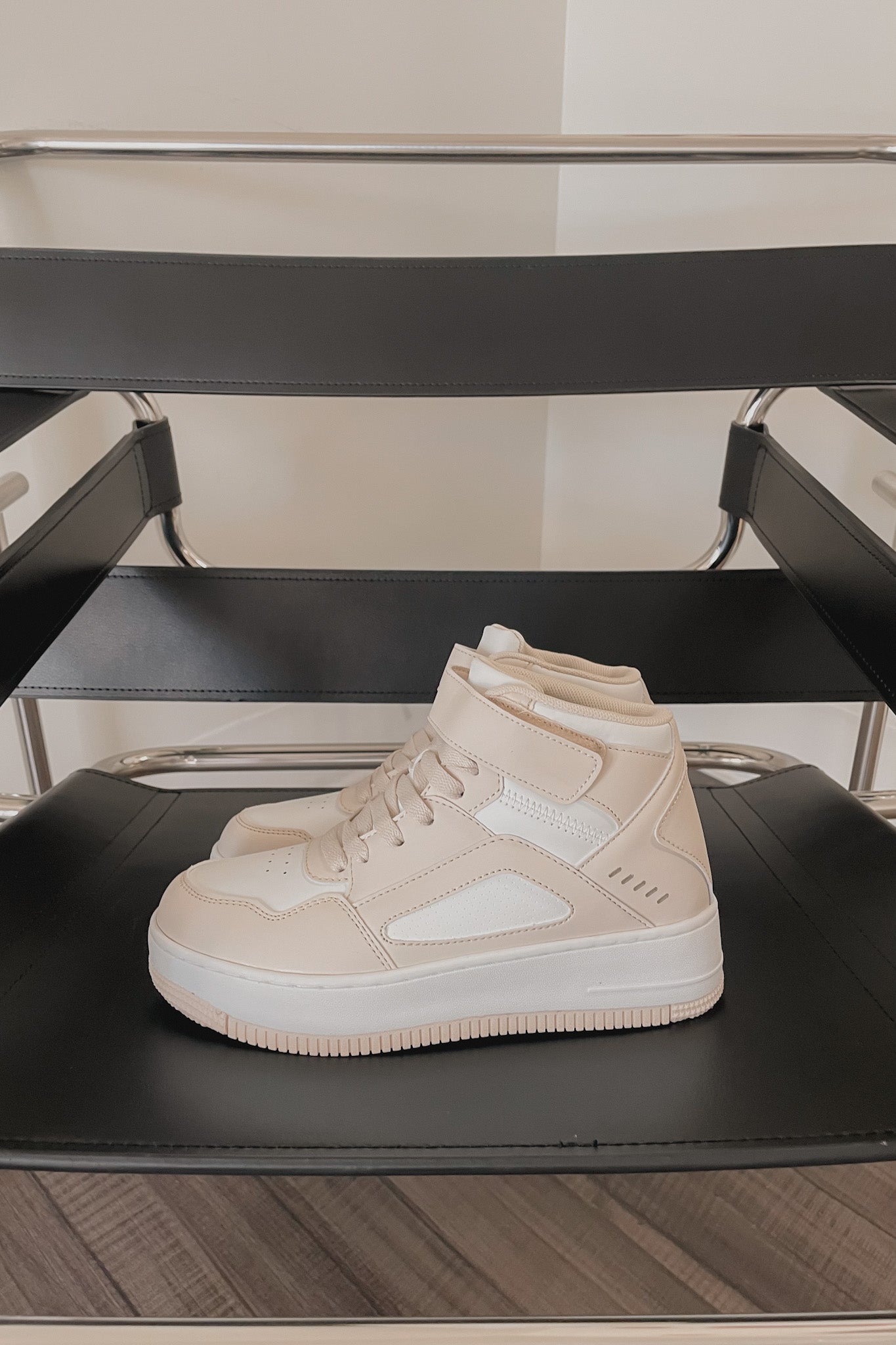The Cora High Top Sneakers are a wardrobe staple! Featuring a platform detail and velcro strap, these shoes are the perfect trendy piece! Available in solid and beige combo. Pair with some for the ultimate streetwear look!