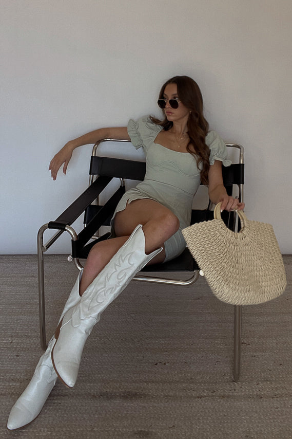 Star of the show in the Drew Puff Sleeve Corset Linen Mini Dress. This adorable open back mini dress features puff sleeves, a corset bodice, and a front leg slit for a flattering fit. Available in white and sage. Pair with the to complete this gorgeous look.