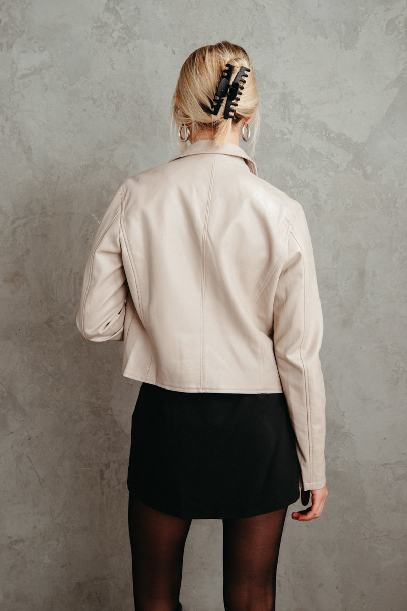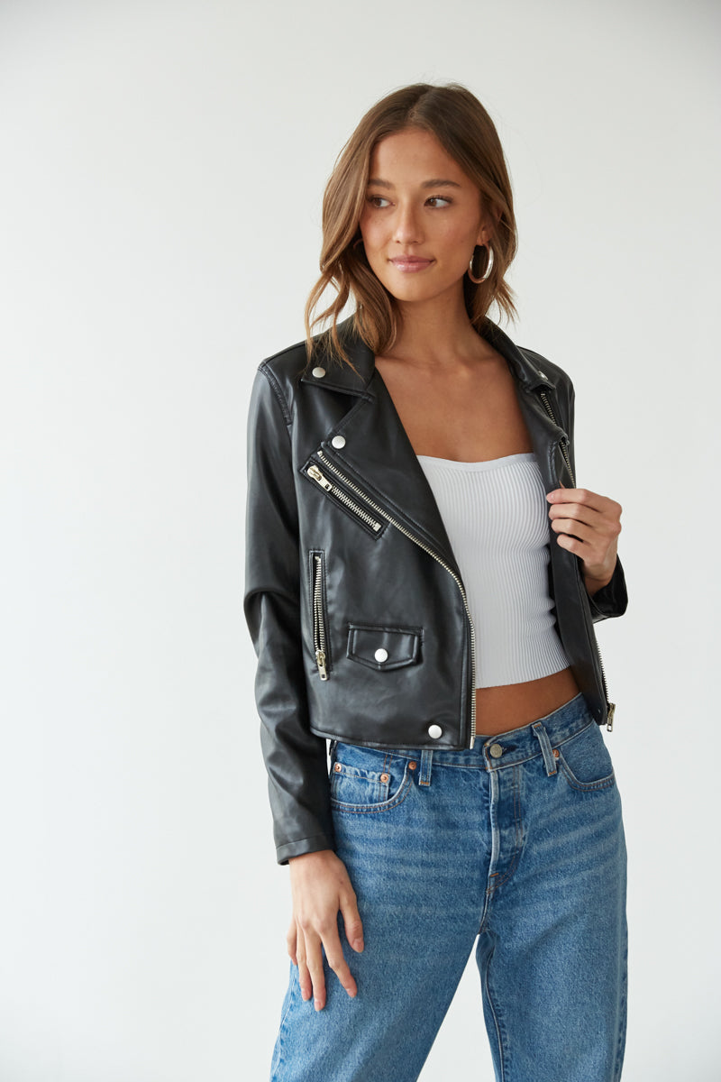 The Fallon Faux Leather Jacket is a must have closet staple. Featuring a pointed collar button detail and double zipper side pockets. Pair with some to complete the look!
