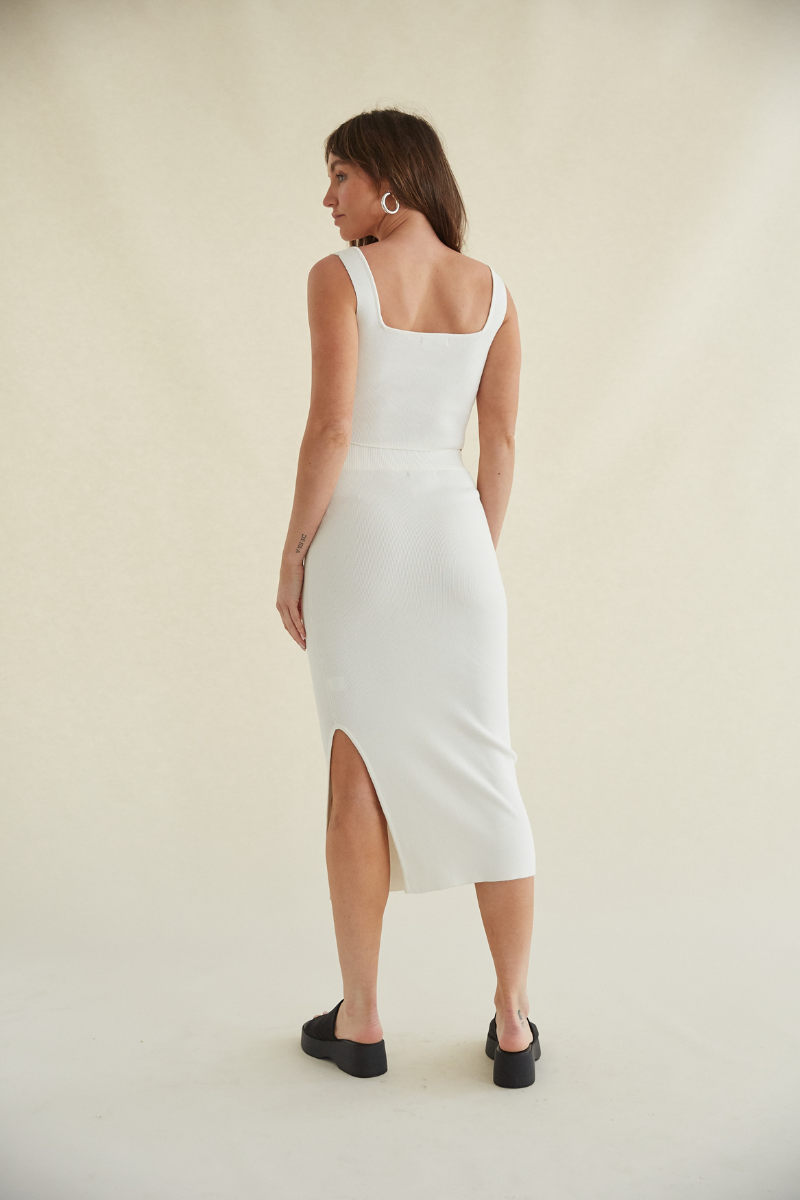 Get ready for warm summer days in the Jacqueline High-Rise Knit Midi Skirt! This ribbed skirt is complete with a flattering thick waistband and left side slit. Available in cream and blue. Pair with the to complete the set!