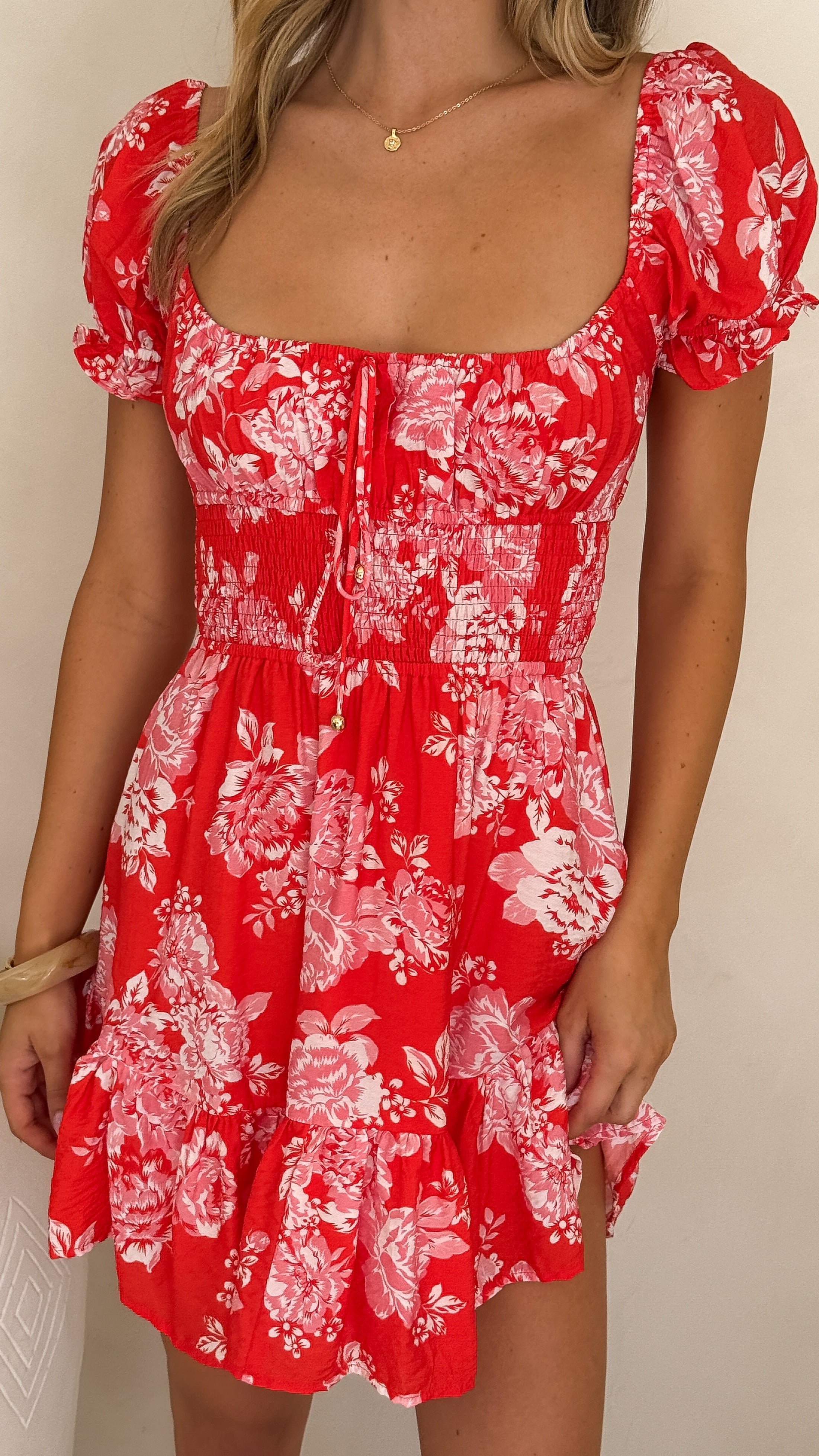 The Kori Mini Dress in Red Floral combines romantic details with refined elegance. Featuring a square elasticated neckline and delicate mini balloon sleeves with frill edges, this dress offers a graceful silhouette. A decorative tie detail adorned with gold-look beads adds a sophisticated touch to the bust, while the shirred waistband creates a flattering fit. The ruffled hemline completes the charming design, and the lined construction ensures comfort and confidence.