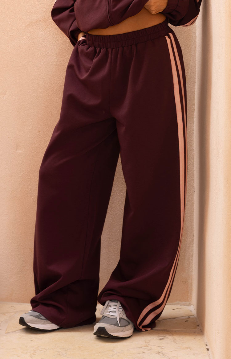 Comfort meets cool in the Kosie Burgundy/Pink Stripe Track Pants. Featuring a relaxed loose fit and bold contrast stripes, these fully lined are perfect for off-duty days. Pair with the matching track and sneakers for a statement look.