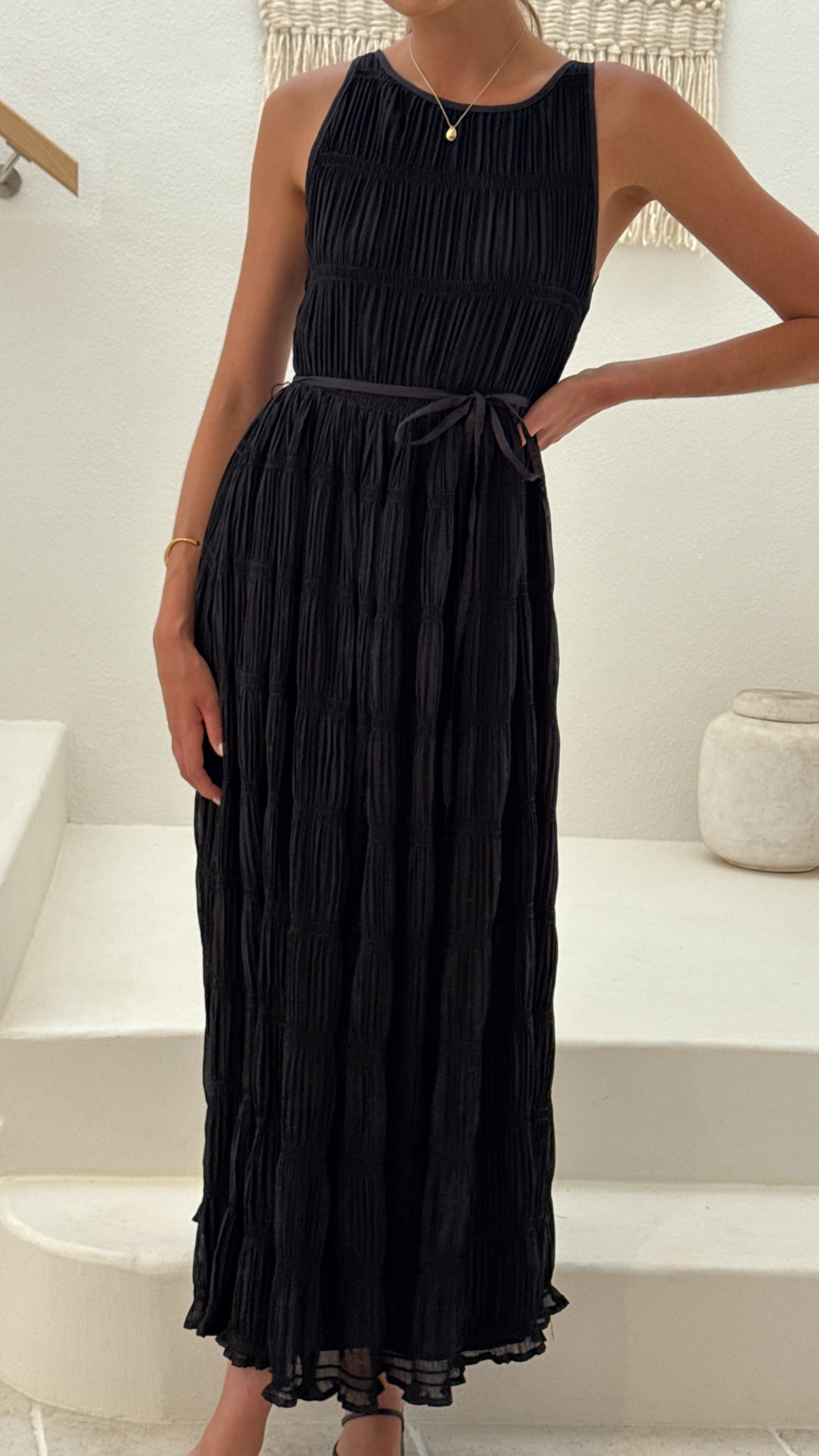 The Lassie Maxi Dress in Black features a sleeveless design with a classic crew neckline, enhancing its elegant silhouette. Crafted from textured, sheer fabric and fully lined for comfort, it offers a refined layering effect. The removable waist tie allows for a customised fit.