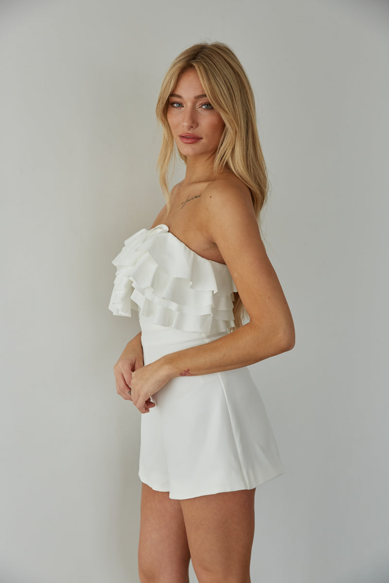 Attend your next social event in style in the Leilani Strapless Romper! This chic romper features a straight across strapless neckline, tiered ruffle bust, fitted waist, and relaxed shorts. Available in white and pink. Pair with a simple to complete the look!