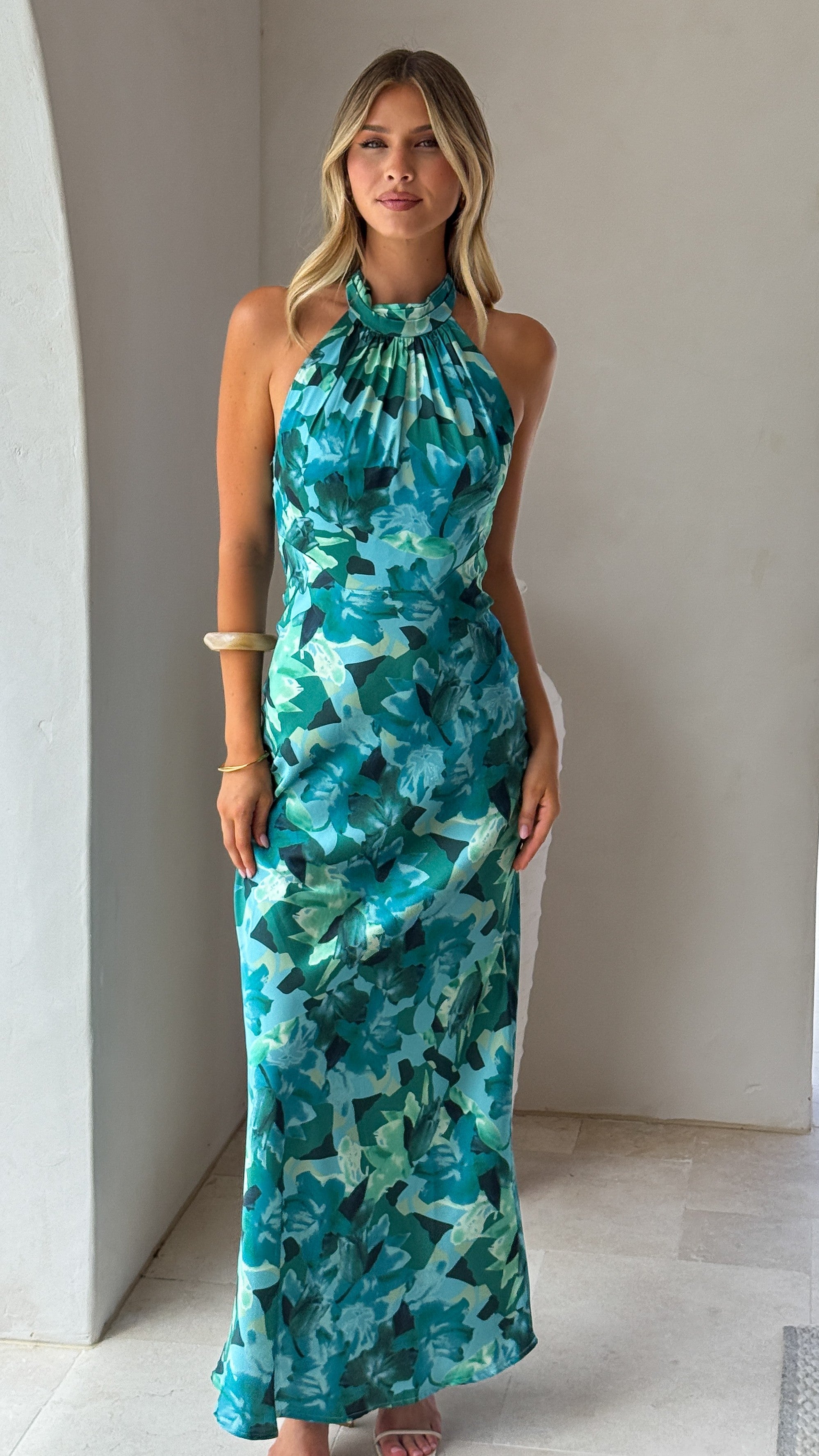 Elevate your wardrobe with this elegant maxi dress, featuring a flattering halter neck and adjustable tie-up back for the perfect fit. The concealed back zipper ensures a seamless look, while the lined bust provides both comfort and confidence.
