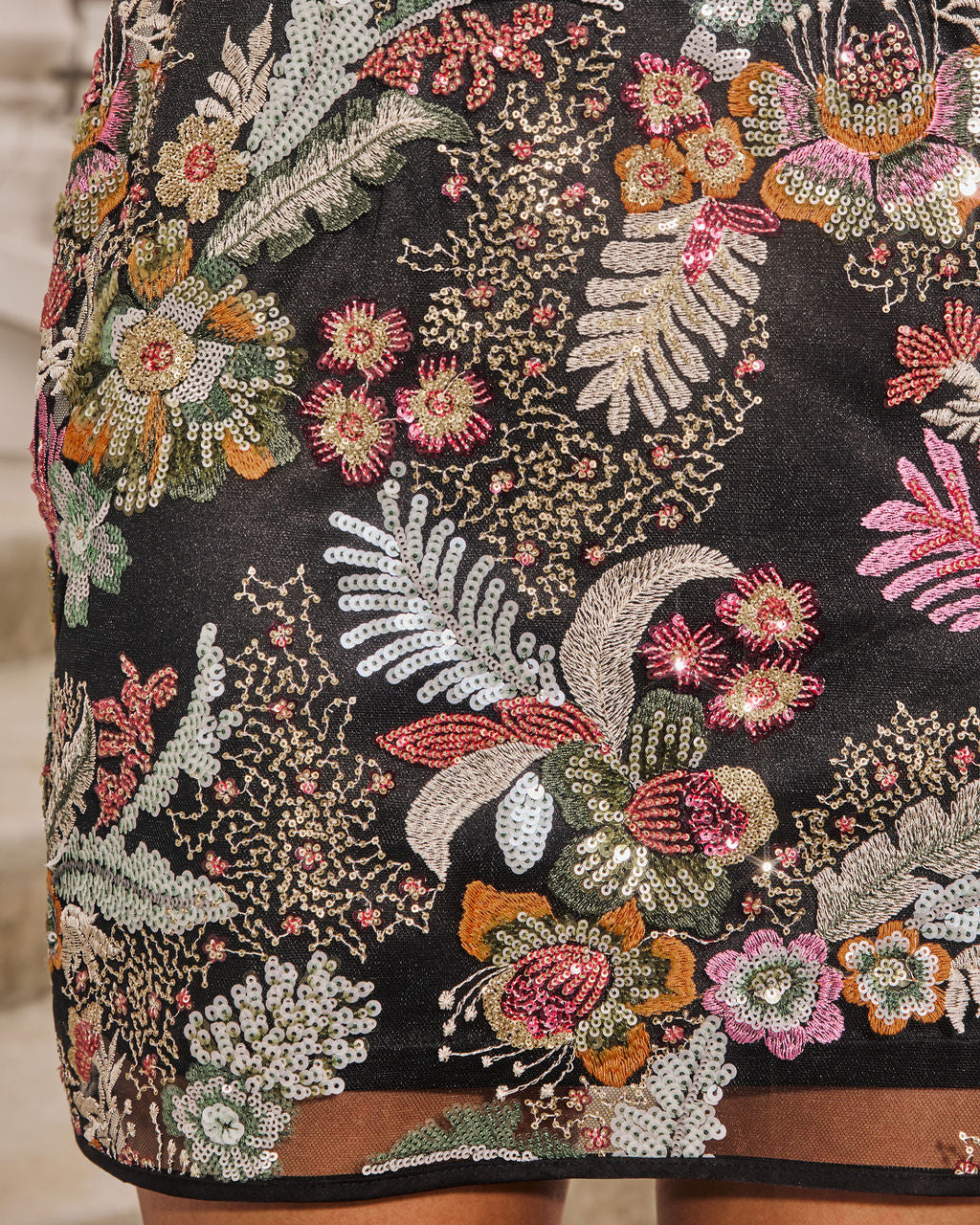 The Swipe Right Embroidered Mini Dress turns heads with its dazzling sequin botanical embroidery layered over delicate mesh fabric. Though the fabric holds its shape with no stretch, it moves with your every step, making it the ideal pick for romantic nights out, or any special occasion where you want to feel effortlessly unforgettable.