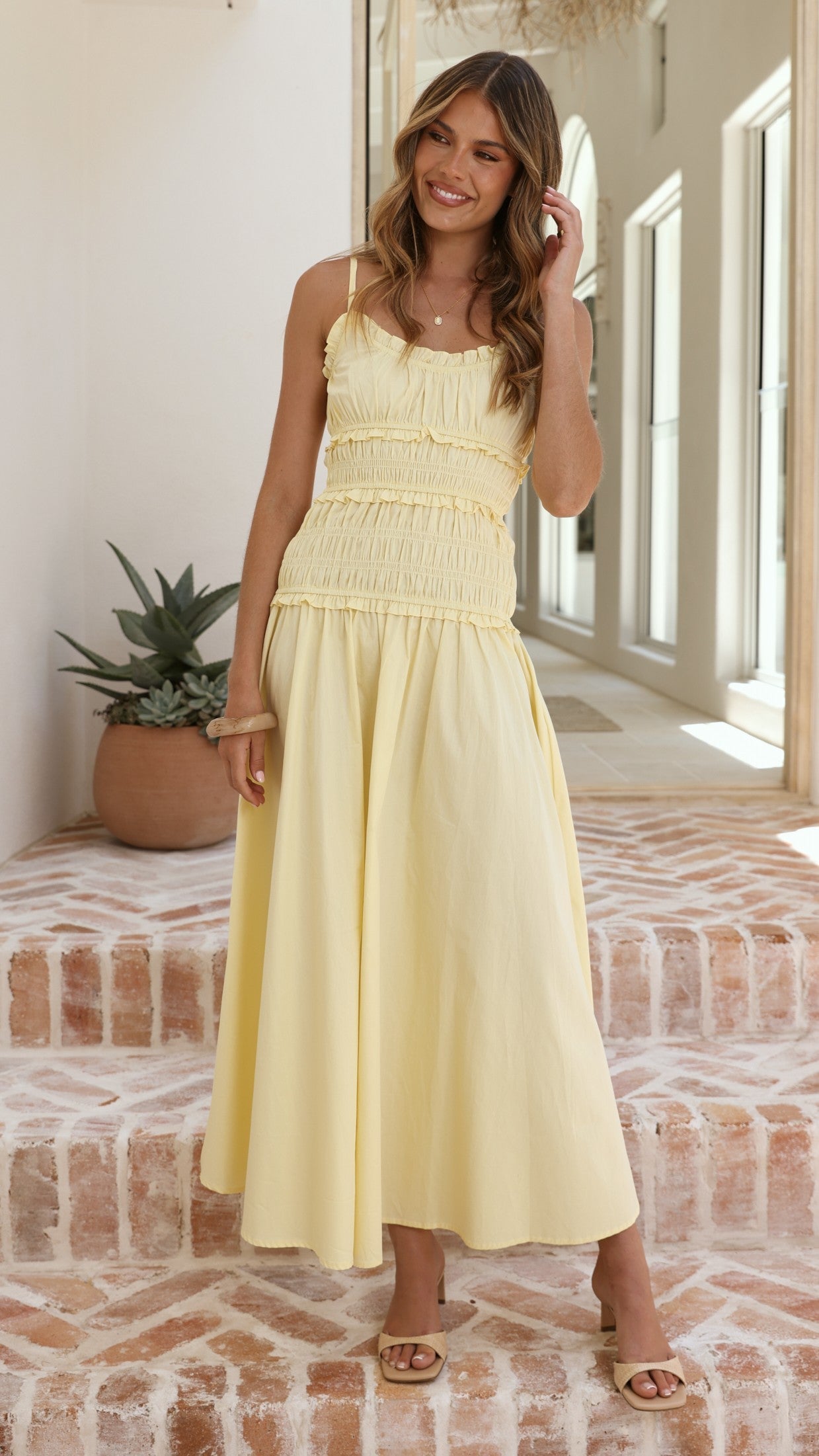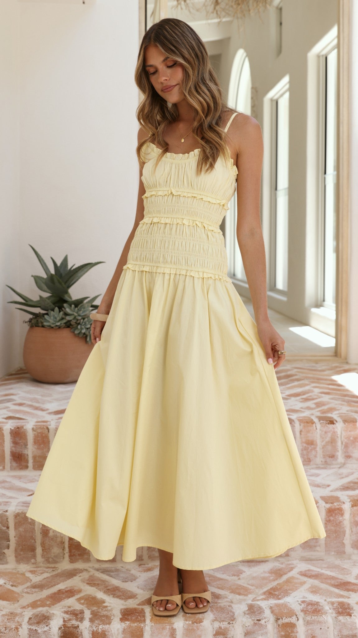 The Vida Maxi Dress in Yellow features adjustable spaghetti straps and a ruffle-detail scoop neckline, adding a delicate touch to its sophisticated design. Its tiered elasticated gathering and fitting shirring through the body create a flattering silhouette while ensuring comfortable wear.